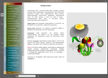 Взгляните на интерфейс видеокниг: крайняя левая панель — оглавление и иконостас инструментов, далее идет текст, справа — видеомодуль. Алгоритм работы прост: мы просматриваем и прослушиваем урок, параллельно поглядывая на текст для прояснения сложных моментов. Это очень ценная методика! Дело в том, что при изучении компьютерных программ чистого видеоряда, с одной стороны, либо только текста — с другой, в большинстве случаев просто недостаточно. И в том и в другом случае материал просто ускользает от усвоения.
