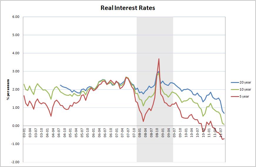 Перед нами три графика, отражающих динамику реальной процентной ставки (не вдаваясь в детали: это процентная ставка, очищенная от инфляции) в том виде, как она отражается в 20ти, 10ти и 5тилетних казначейских долговых обязательствах, защищенных от инфляции (Treasury Inflation-Indexed Securities). Посмотрите на 5летнюю бумагу: процентная ставка по ней … почти МИНУС 1 %!